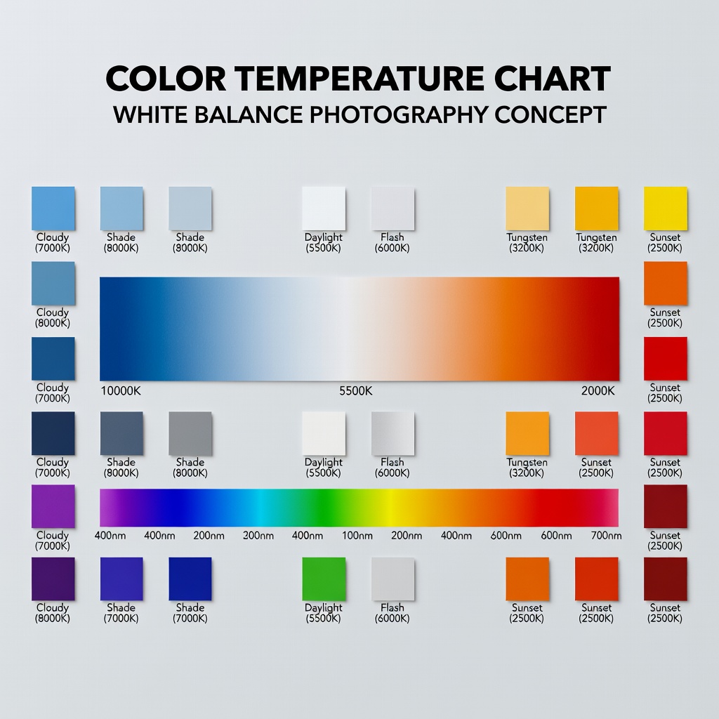 - High Kelvin (7000-10000K): Cool/blue light (shade, overcast sky, blue hour)